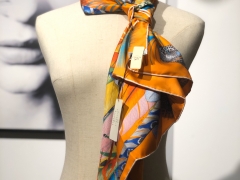 2020春夏新款 《羽饰庆典》橙色 手工卷边斜纹真丝方巾(100%桑蚕丝) 90*90cm