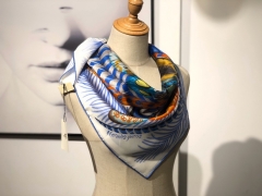2020春夏新款 《羽饰庆典》 蓝色 手工卷边斜纹真丝方巾(100%桑蚕丝) 90*90cm