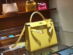 HERMES 爱马仕 凯莉包 Kelly 25cm 28cm 鸵鸟皮 太阳黄 9V 金银扣都可以定制