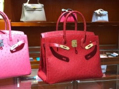 HERMES 爱马仕 铂金包 Birkin 30cm 鸵鸟皮 宝石红 B5 Rubis 金银扣都可以定制