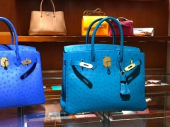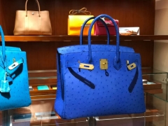HERMES 爱马仕 铂金包 Birkin 30cm 鸵鸟皮 湖水蓝 7V Blue Azteque 金银扣都可以定制