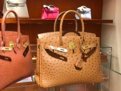 HERMES 爱马仕 铂金包 Birkin 30cm 鸵鸟皮 金棕色 C47 金银扣都可以定制