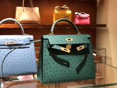 HERMES 爱马仕 凯莉包 Kelly 25cm 28cm 鸵鸟皮 孔雀绿 Z6 Malaoitte 金银扣都可以定制