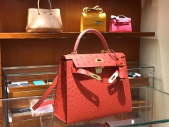 HERMES 爱马仕 凯莉包 Kelly 25cm 28cm 鸵鸟皮 爱马仕红 55 Rougeh 金银扣都可以定制