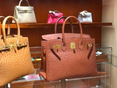 HERMES 爱马仕 铂金包 Birkin 30cm 鸵鸟皮 焦糖色 金银扣都可以定制
