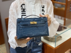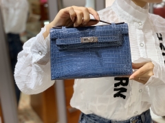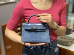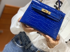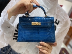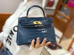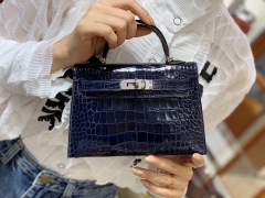 HERMES 爱马仕女包批发 Mini Kelly 22cm 风暴蓝 现货 原厂鳄鱼皮