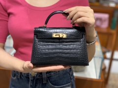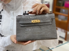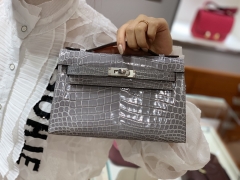 HERMES 爱马仕女包批发 Mini Kelly 22cm 沥青灰 现货 原厂鳄鱼皮