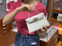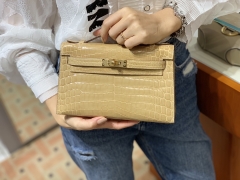 HERMES 爱马仕女包批发 Mini Kelly 22cm 卡其色 现货 原厂鳄鱼皮