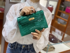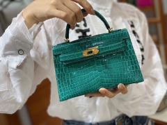 HERMES 爱马仕女包批发 Mini Kelly 22cm 翡翠绿 现货 原厂鳄鱼皮