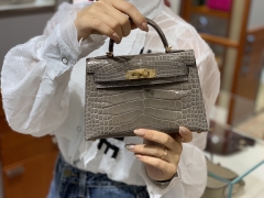HERMES 爱马仕女包批发 Mini Kelly 22cm 银河灰 现货 原厂鳄鱼皮