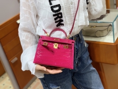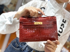 HERMES 爱马仕女包批发 Mini Kelly 22cm 酒红色 现货 原厂鳄鱼皮