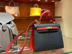 HERMES 爱马仕 凯莉包 Kelly 25CM 28CM Epsom 黑色拼国旗红 拉丝金