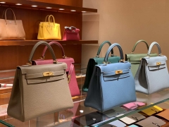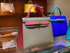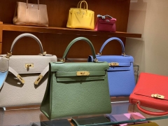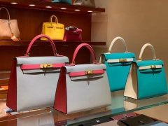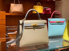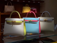 HERMES 爱马仕 凯莉包 Kelly 25CM 28CM Epsom 马卡龙兰拼唇膏粉 拉丝金