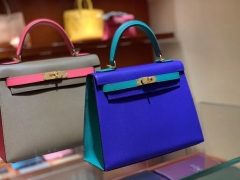 HERMES 爱马仕 凯莉包 Kelly 25CM 28CM Epsom 电光蓝拼孔雀蓝 拉丝金