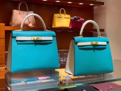 HERMES 爱马仕 凯莉包 Kelly 25CM 28CM Epsom 孔雀蓝拼奶昔白 拉丝金