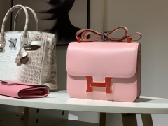 HERMES 爱马仕 空姐包 Constance 18cm 24cm 奶昔粉 蜥蜴扣