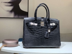 HERMES 爱马仕 铂金包 Birkin 鳄鱼皮 纯手工蜡线 黑色 银扣 全套专柜包装