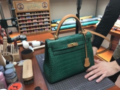 HERMES 爱马仕 Kelly 28CM 现货系列 配全套专柜原版包装 亮面鳄鱼 6Q 翡翠绿 Vert Emeraude拼 金棕 GOLD CK37